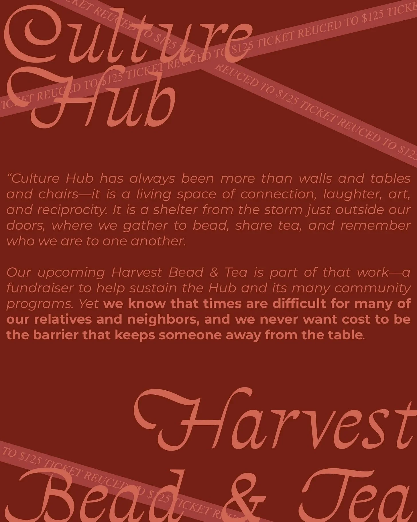 We’ve consolidated to one gathering at 11 AM on November 15. Tickets are now $125. Your ticket still helps sustain Culture Hub’s programming, space, and staff—every bead, every dollar, every act of reciprocity keeps this space alive.