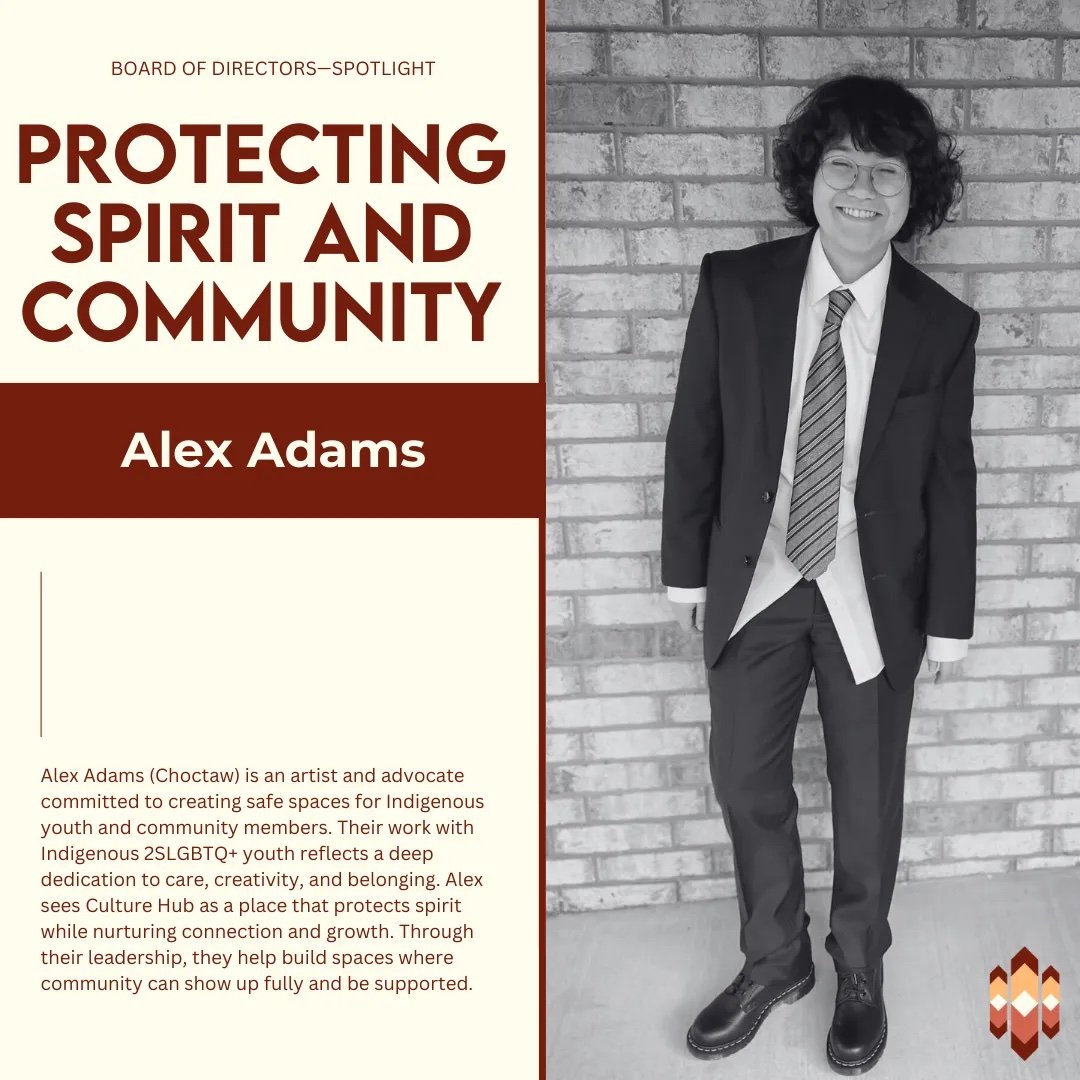 Alex Adams calls Norman, Oklahoma home and is a proud citizen of the Choctaw Nation. An artist at heart, they spend their days working at a jewelry craft store while serving on staff for Cousins, an Indigenous 2SLGBTQ+ youth group. Creativity flows through every part of Alex’s life—from sketching and writing to photography and music.