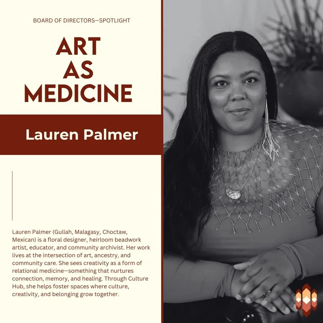Lauren shares that she was inspired by Culture Hub before becoming a regular community member within its walls. “That vision is what first drew me to Culture Hub,” she says. Over time, the organization became a deeply meaningful space for her, one that embodies reciprocity, care, and knowledge flowing in all directions. Today, Lauren serves on its Board of Directors, guiding its mission forward while honoring those who came before her.